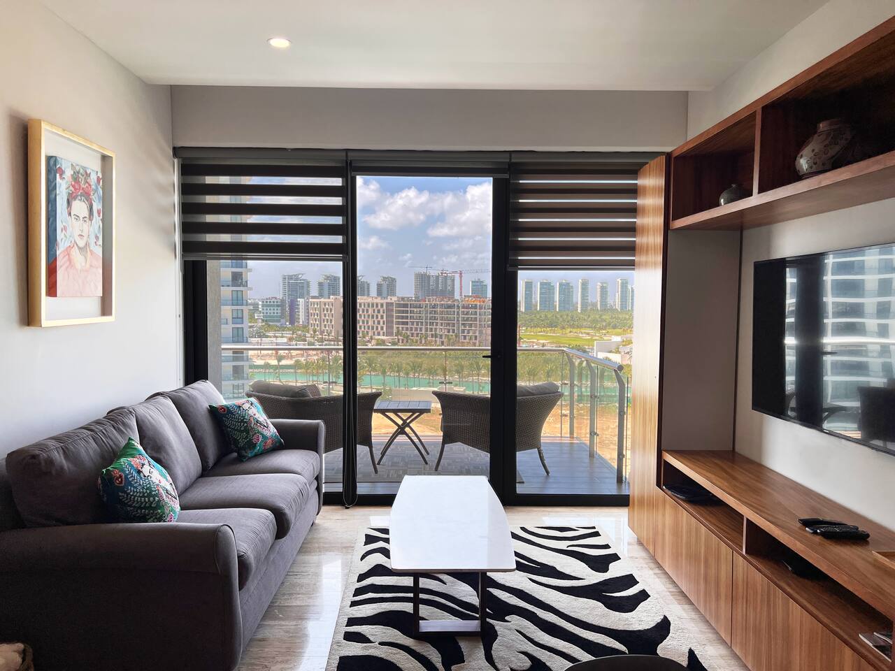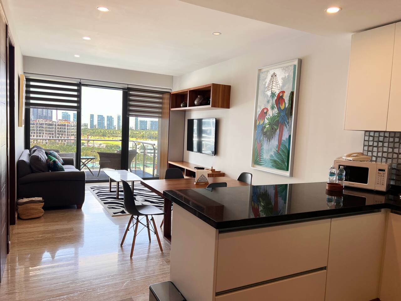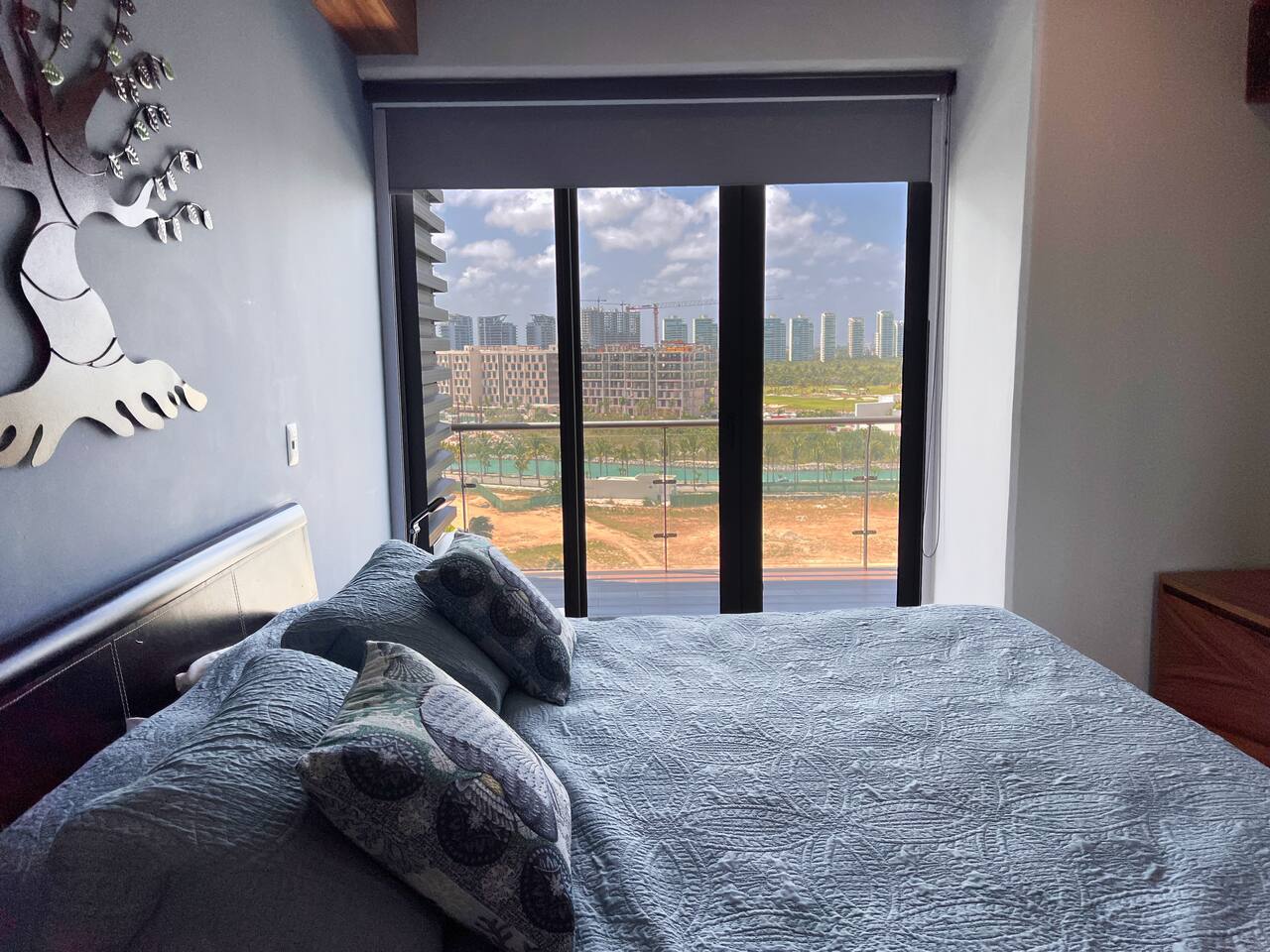 Condominio: Disfruta de dos albercas climatizadas, acceso directo a la plaza Marina Puerto Cancun . Estacionamiento techado sin costo dentro del condominio. Departamento: El departamento cuenta con entrada independiente (self check inn), se puede accesar a cualquier hora después de las 3pm. Al entrar se encuentra la cocina equipada con todo lo necesario para cocinar, un amplia zona de sala con sofa cama, el comedor para 4 personas, una terraza con vista al mar, canal, shark tower y los yates en puerto Cancún. La recamara tiene una cómoda cama King size y baño independiente con walk in closet. Cuenta con lavadora/secadora, cuarto de lavado, wifi de alta velocidad, espectacular balcon con vista a los yates y canal, programación de televisión con canales nacionales, internacionales, deportes, películas y series. Si tienes un invitado extra en tu alojamiento o bien si quieres mayor comodidad podemos agregar las siguientes opciones: -sofá cama individual -colchón Inflable Es importante que esta requerimiento lo hagas previamente para tener todo listo para cuando llegues a tu alojamiento.