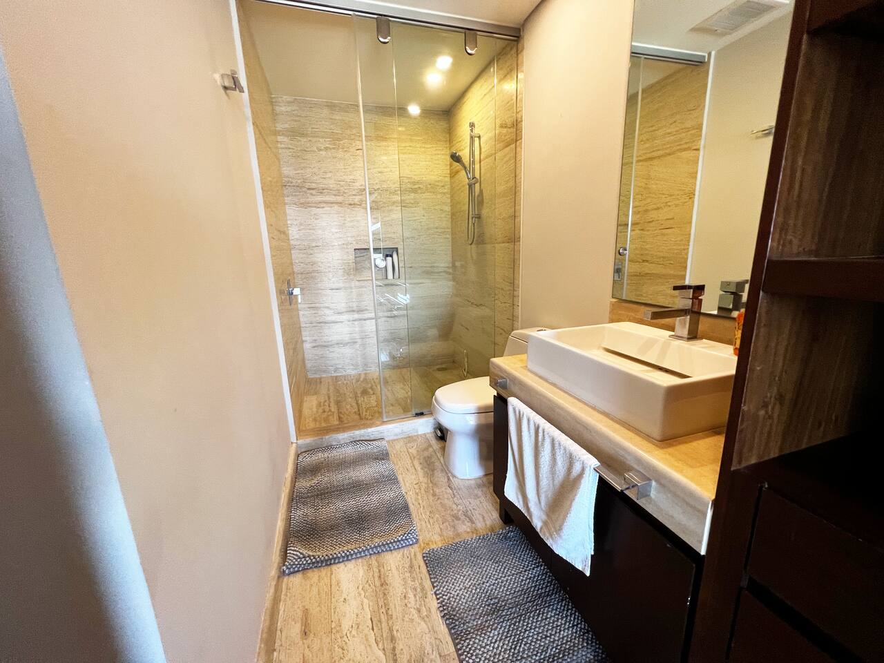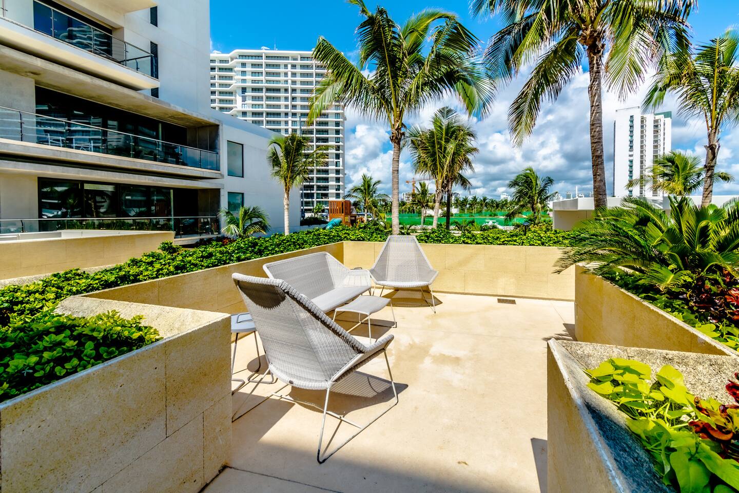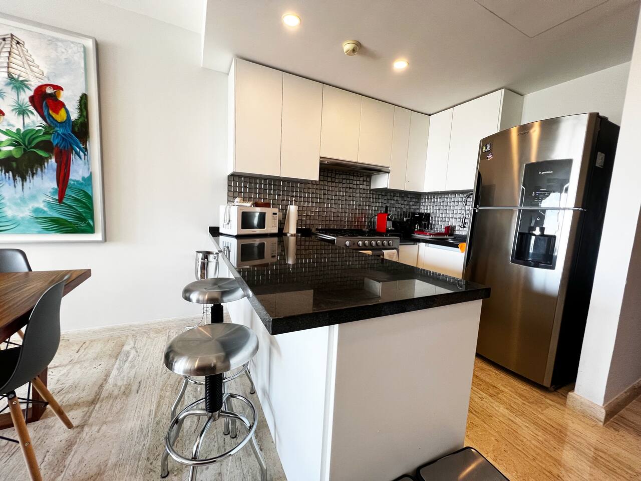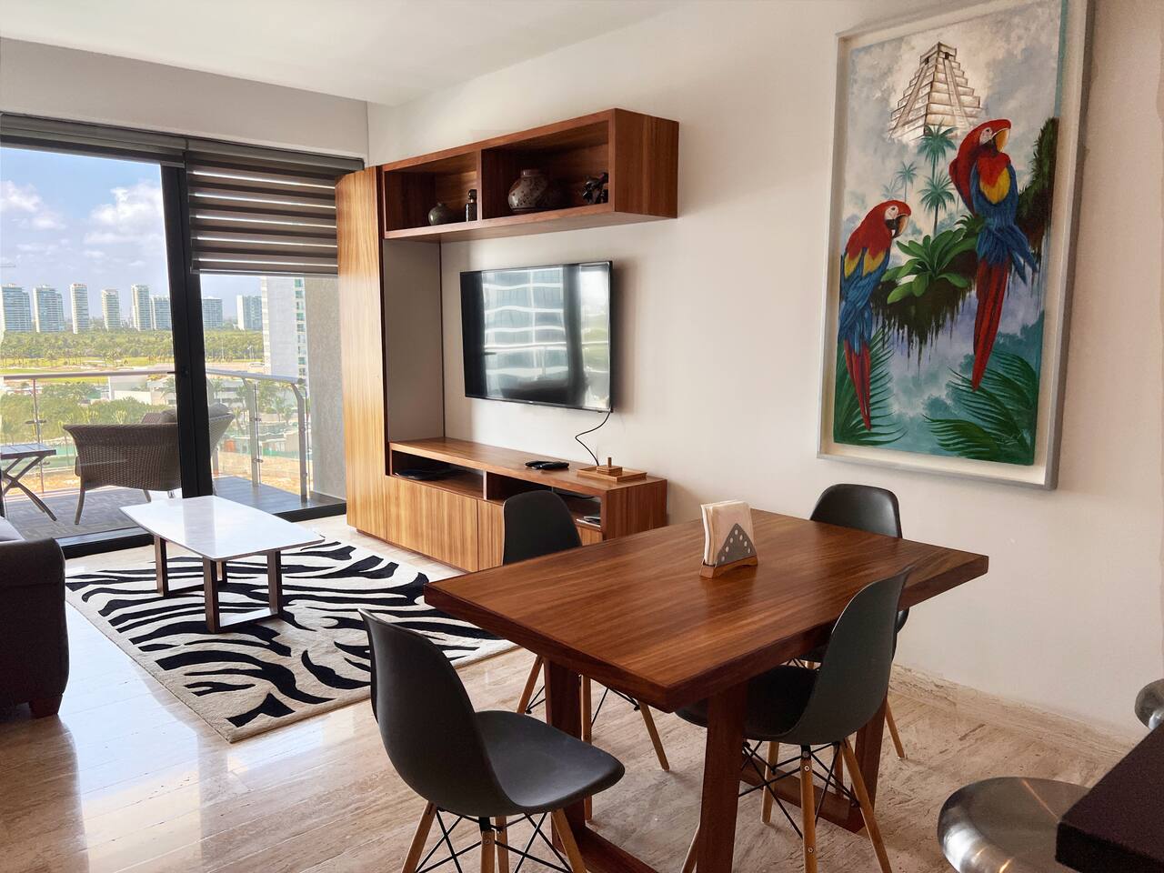 Condominio: Disfruta de dos albercas climatizadas, acceso directo a la plaza Marina Puerto Cancun . Estacionamiento techado sin costo dentro del condominio. Departamento: El departamento cuenta con entrada independiente (self check inn), se puede accesar a cualquier hora después de las 3pm. Al entrar se encuentra la cocina equipada con todo lo necesario para cocinar, un amplia zona de sala con sofa cama, el comedor para 4 personas, una terraza con vista al mar, canal, shark tower y los yates en puerto Cancún. La recamara tiene una cómoda cama King size y baño independiente con walk in closet. Cuenta con lavadora/secadora, cuarto de lavado, wifi de alta velocidad, espectacular balcon con vista a los yates y canal, programación de televisión con canales nacionales, internacionales, deportes, películas y series. Si tienes un invitado extra en tu alojamiento o bien si quieres mayor comodidad podemos agregar las siguientes opciones: -sofá cama individual -colchón Inflable Es importante que esta requerimiento lo hagas previamente para tener todo listo para cuando llegues a tu alojamiento.