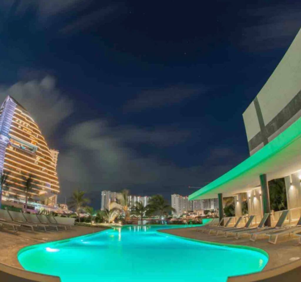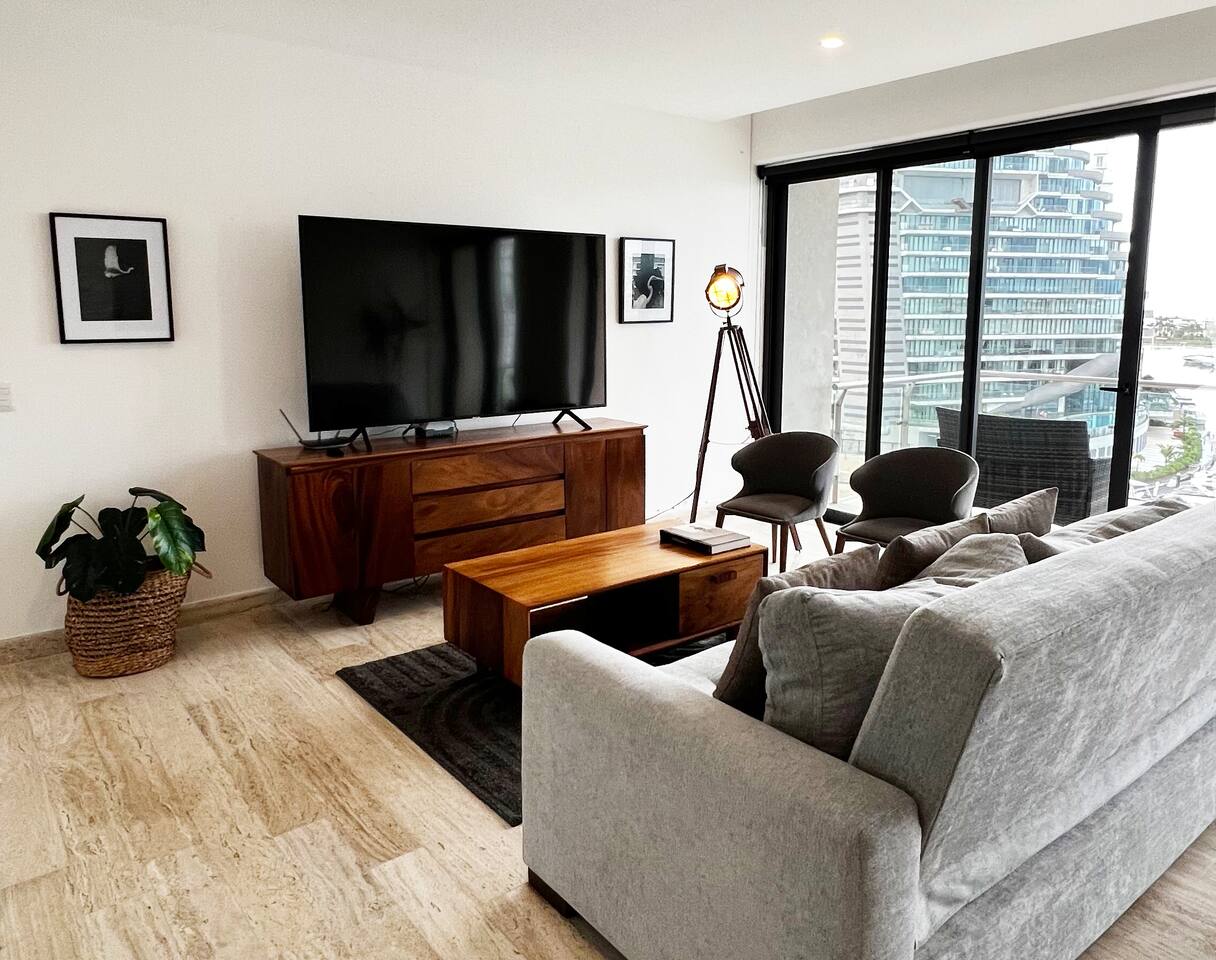 Disfruta de unas hermosas vacaciones con la mejor vista de Puerto Cancun, las amenidades incluyen cafetera, aire acondicionado, hermosas sabanas blancas, toallas para playa, tv internacional, wifi de alta velocidad, agua purificada, los esenciales para la cocina, etc. Condominio: Disfruta de dos albercas climatizadas, acceso directo a la plaza Marina Puerto Cancún. El departamento cuenta con entrada independiente (self check inn), se puede accesar a cualquier hora después de las 3pm. Al entrar se encuentra la cocina equipada con todo lo necesario para cocinar, un amplia zona de sala con sofa, el comedor para 6 personas, una terraza con vista a la piscina, canal, shark tower y los yates en puerto Cancún. La recamara principal tiene una cómoda cama y baño independiente y la recamara secundaria una comoda cama matrimonial. Cuenta con lavadora, wifi de alta velocidad, espectacular balcon con vista a los yates y canal, programación de televisión con canales nacionales, internacionales, deportes, películas y series. Si tienes un invitado extra en tu alojamiento o bien si quieres mayor comodidad podemos agregar las siguientes opciones: -sofá cama individual -colchón Inflable Es importante que esta requerimiento lo hagas previamente para tener todo listo para cuando llegues a tu alojamiento.