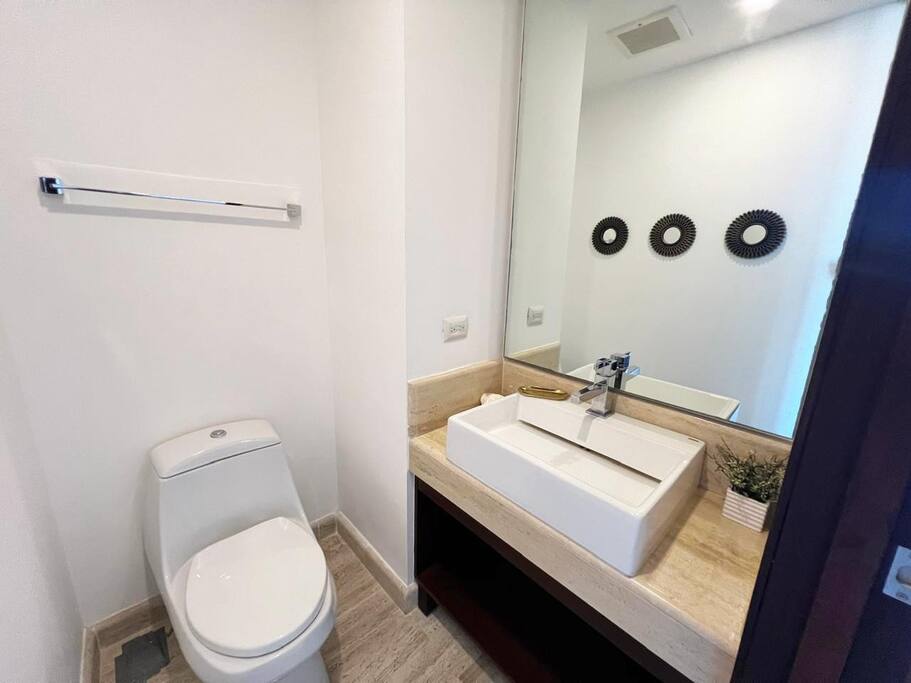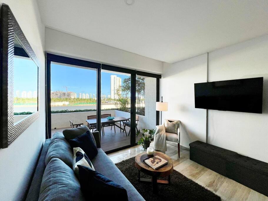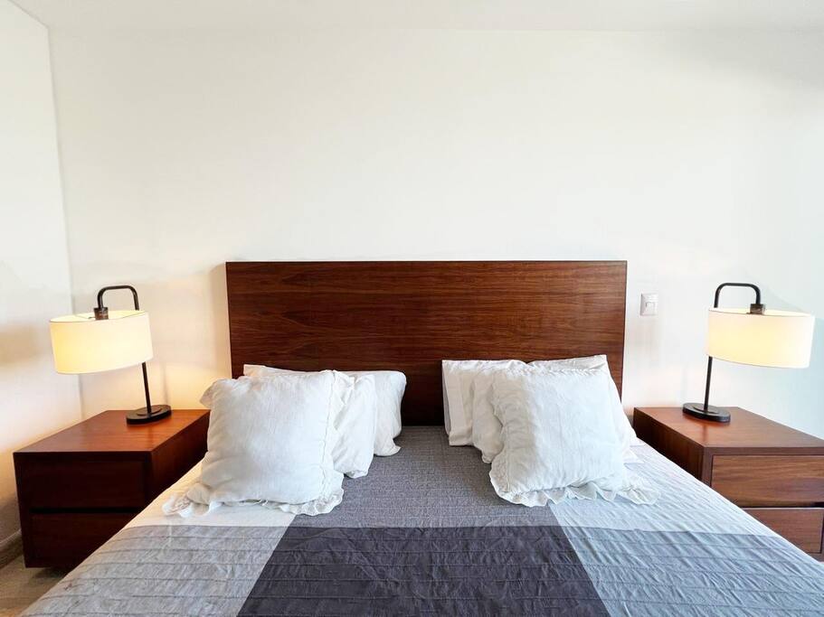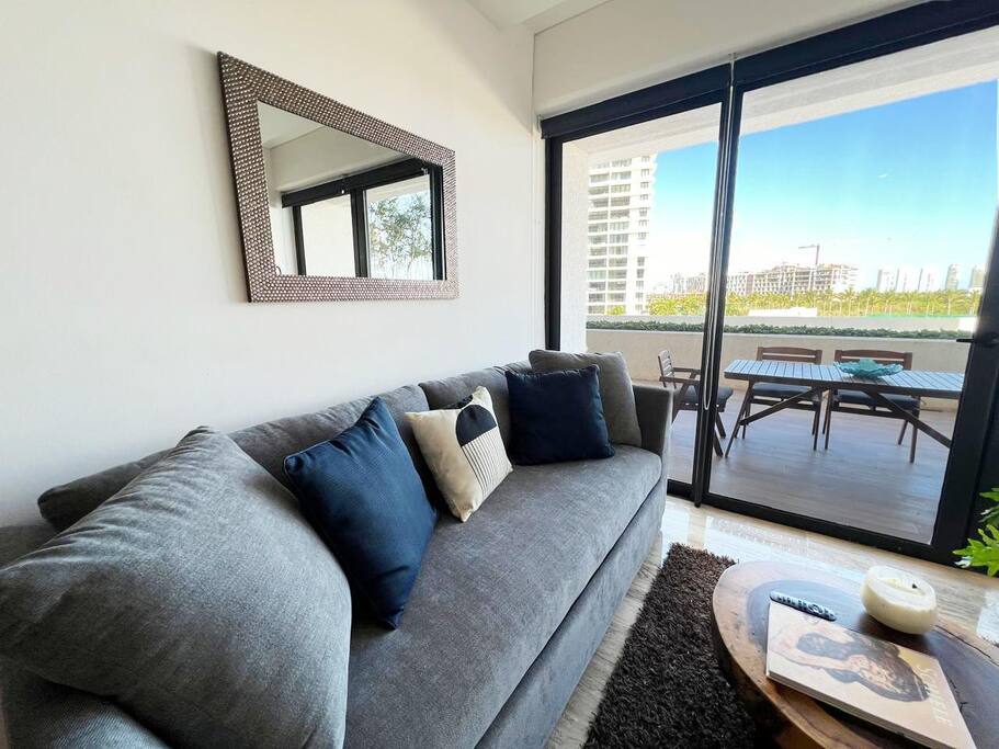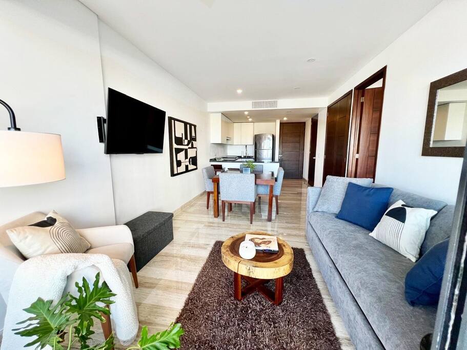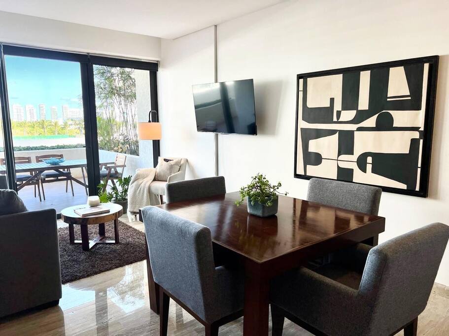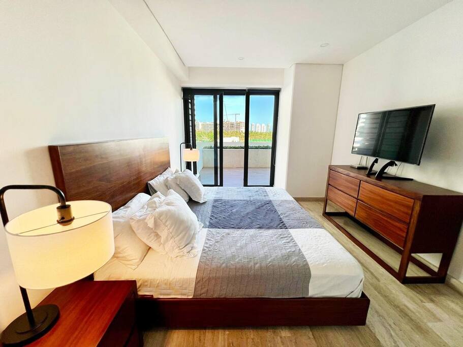 El departamento cuenta con entrada independiente (self check in), se puede accesar a cualquier hora después de las 3pm. Al entrar se encuentra la cocina equipada con todo lo necesario para cocinar, un amplia zona de sala con sofa cama, el comedor para 4 personas, una terraza con vista al mar, canal, shark tower y los yates en puerto Cancún. La recamara tiene una cómoda cama King size y baño independiente con walk in closet. Cuenta con lavadora/secadora, cuarto de lavado, wifi de alta velocidad, espectacular balcón con vista a la torre shark de Puerto Cancun, programación de televisión con canales nacionales, internacionales, deportes, películas y series. Si tienes un invitado extra en tu alojamiento o bien si quieres mayor comodidad, la sala del departamento cuenta con un sofa cama super amplio y cómodo.