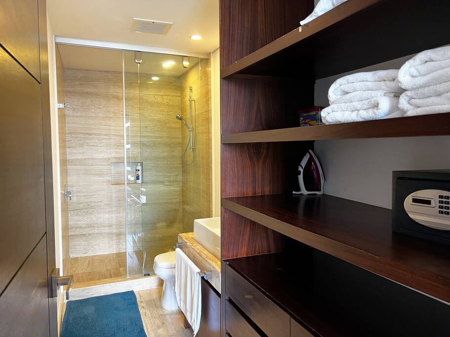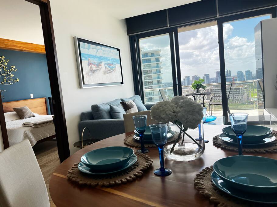 Condominio: Disfruta de dos albercas climatizadas, acceso directo a la plaza Marina Puerto Cancun. Estacionamiento techado sin costo dentro del condominio. Departamento: El departamento cuenta con entrada independiente (self check inn), se puede accesar a cualquier hora después de las 3pm. Al entrar se encuentra la cocina equipada con todo lo necesario para cocinar, un amplia zona de sala con sofa cama, el comedor para 4 personas, una terraza con vista al mar, canal, shark tower y los yates en puerto Cancún. La recamara tiene una cómoda cama King size y baño independiente con walk in closet. Cuenta con lavadora/secadora, cuarto de lavado, wifi de alta velocidad, espectacular balcon con vista a los yates y canal, programación de televisión con canales nacionales, internacionales, deportes, películas y series. Si tienes un invitado extra en tu alojamiento o bien si quieres mayor comodidad podemos agregar las siguientes opciones: -sofá cama individual -colchón Inflable Es importante que esta requerimiento lo hagas previamente para tener todo listo para cuando llegues a tu alojamiento.