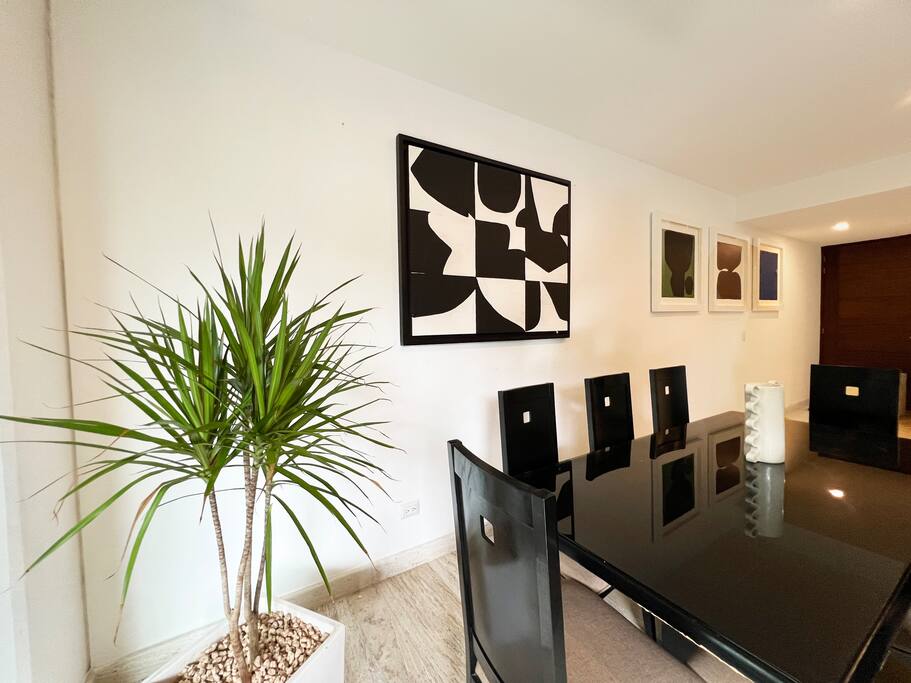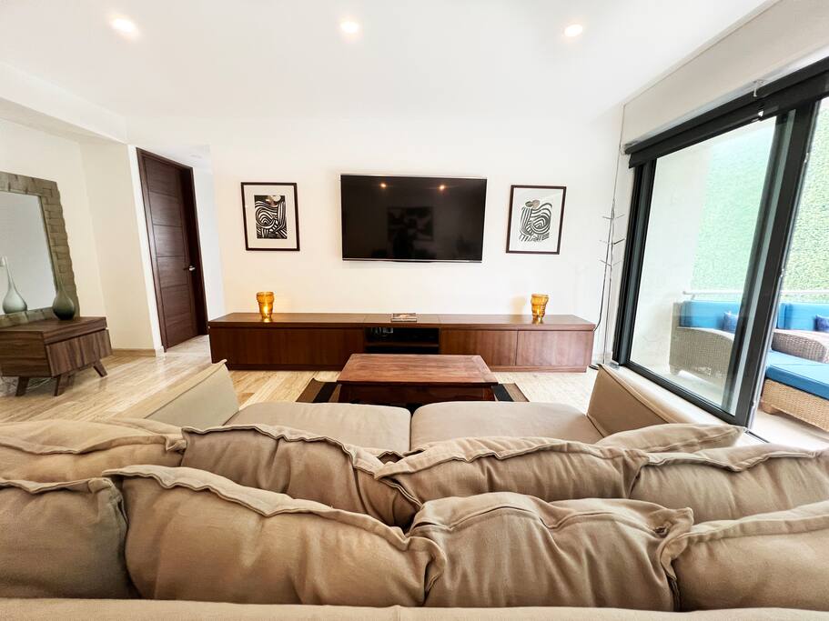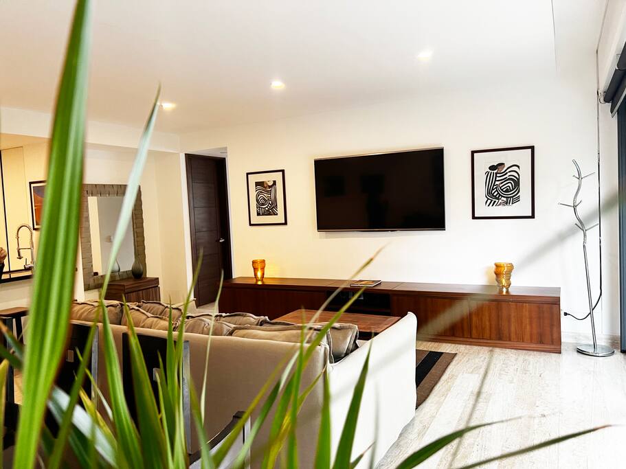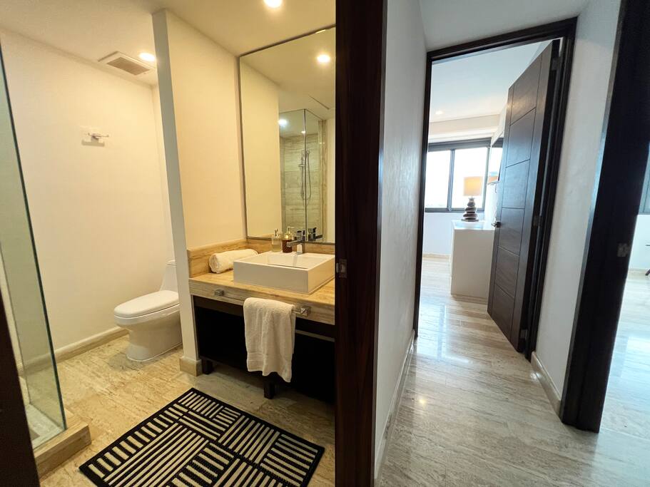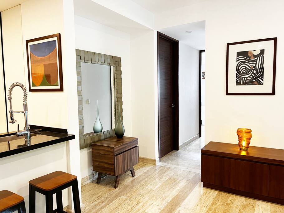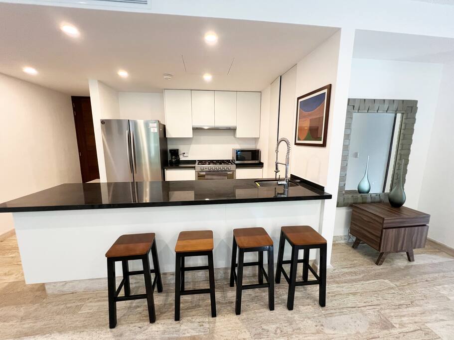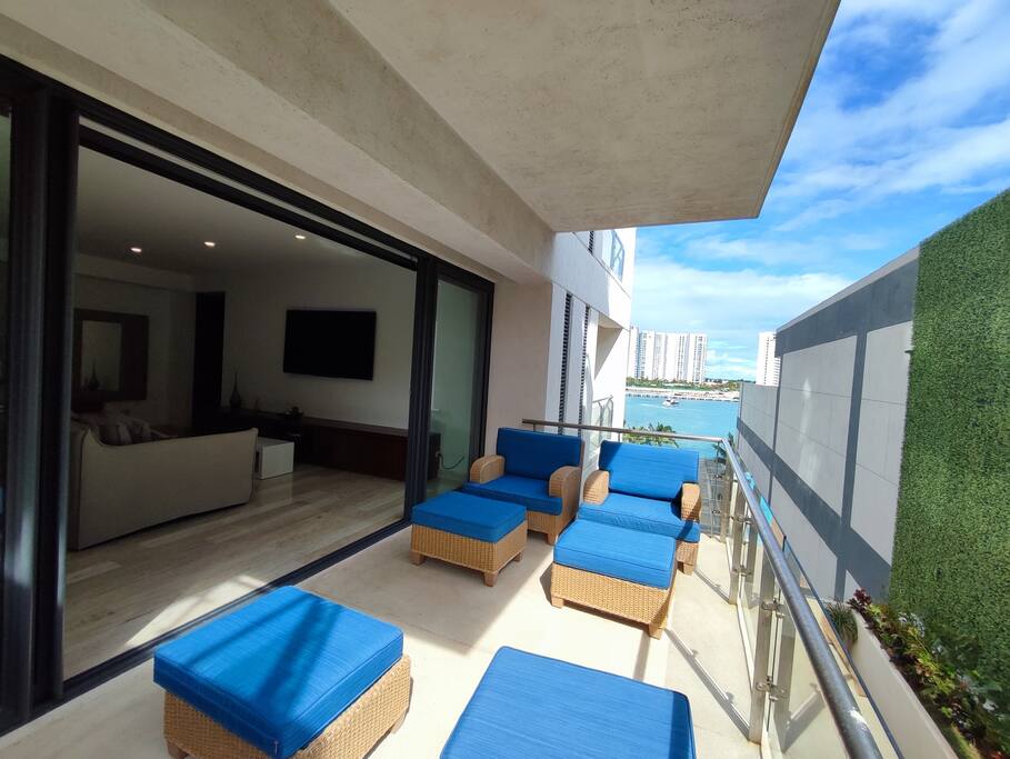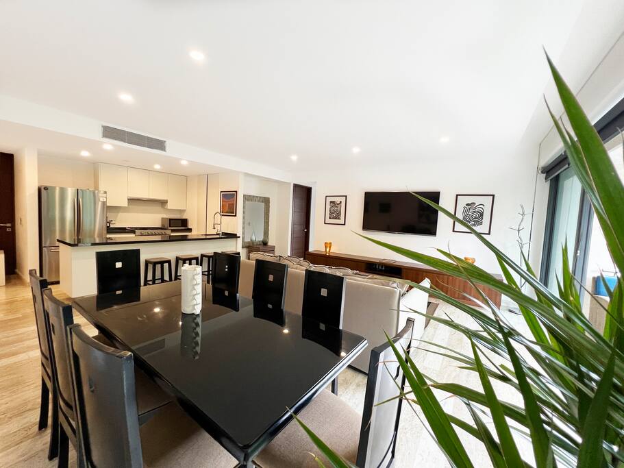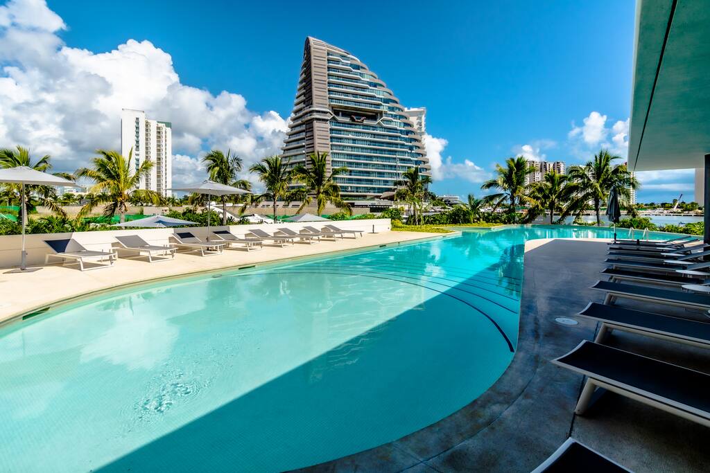 Condominio: Disfruta de dos albercas climatizadas en los meses de inverno en Cancún, acceso directo a la plaza Marina Puerto Cancun. Departamento: El departamento cuenta con entrada independiente (self check inn). Al entrar se encuentra la cocina equipada con todo lo necesario para cocinar, un amplia zona de sala donde el mueble de estar es ideal para descansar, el comedor para 8 personas, una terraza con vista a la alberca y vista al canal de puerto Cancún. La recamara principal con una cómoda cama King size y baño independiente, walking closet, y del lado derecho está la recamara secundaria con 2 camas matrimoniales, y un baño independiente completo por fuera del cuarto. Cuenta con lavadora/secadora, cuarto de lavado, wifi de alta velocidad, balcón con cómodos sillones y descansa pies, programación de televisión con canales nacionales, internacionales, deportes, películas y series. Si tienes un invitado extra en tu alojamiento o bien si quieres mayor comodidad podemos agregar las siguientes opciones: -sofá cama individual -colchón Inflable Es importante que esta requerimiento lo hagas previamente para tener todo listo para cuando llegues a tu alojamiento.