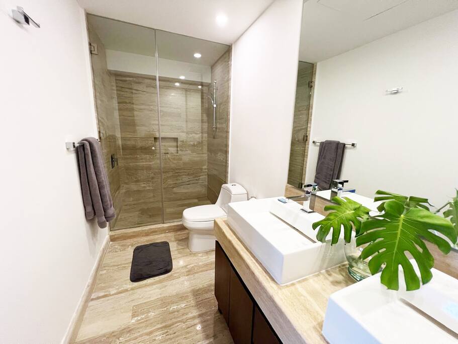 Disfruta del confort en cada rincón. La elegante sala con detalles de diseño es perfecta para relajarte o disfrutar en familia frente a la TV. Desde el balcón, contempla las impresionantes vistas al canal y la Torre Shark. La cocina cuenta con una moderna barra y todos los utensilios necesarios. Los acogedores cuartos ofrecen comodidad y estilo, mientras que los baños están equipados con todo lo esencial. Además, los amplios closets y la caja fuerte garantizan un alojamiento sin preocupaciones.