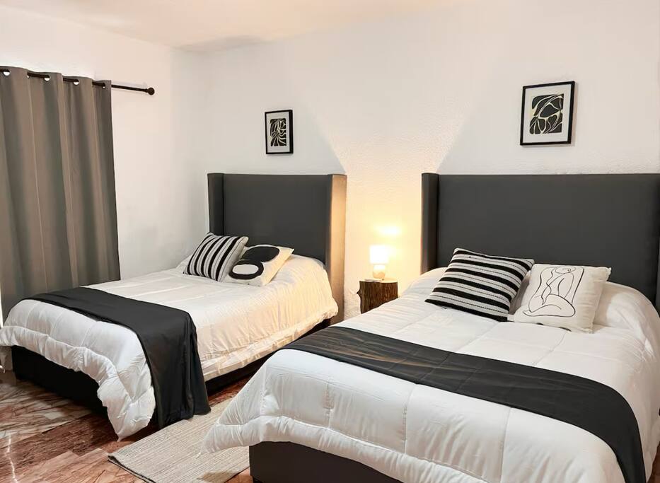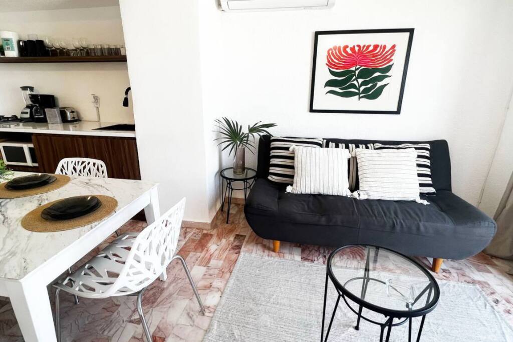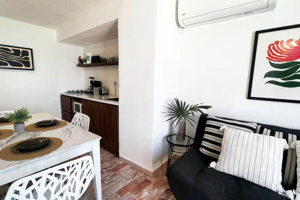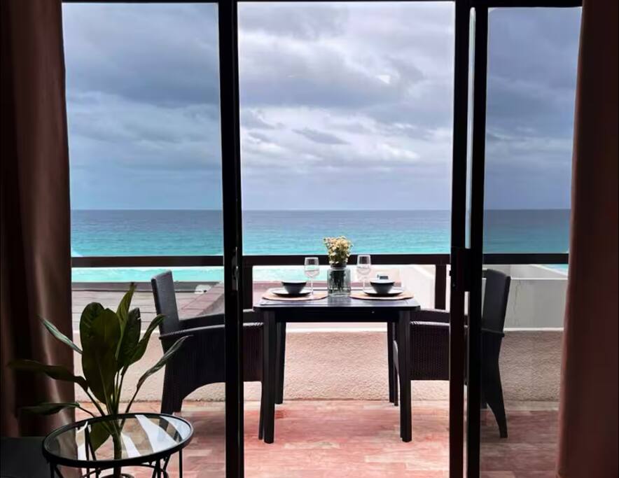 situado en el corazón de la zona hotelera. A solo pasos tienes farmacia, tienda de conveniencia, super mercado, bancos, restaurantes, plazas. Wifi de alta velocidad, cafetera, cafe, agua purificada, aire acondicionado en cada habitación, cocina equipada con todo lo necesario para cocinar. Planta baja: Al entrar al departamento esta un vestibulo, a la derecha esta el baño completo, y y mas adelante un cuarto con dos camas matrimoniales, aire acondicionado, closet y una pantalla para que tu descanso sea completo y disfrutes de tus programas favoritos. planta alta: Al subir las escaleras, esta el cuarto principal, con una cama matrimonial, completo, aire acondicionado. y también en esa planta se encuentra el area social, sala, comedor y cocina. tambien cuenta con una espectacular terraza con vista al mar.