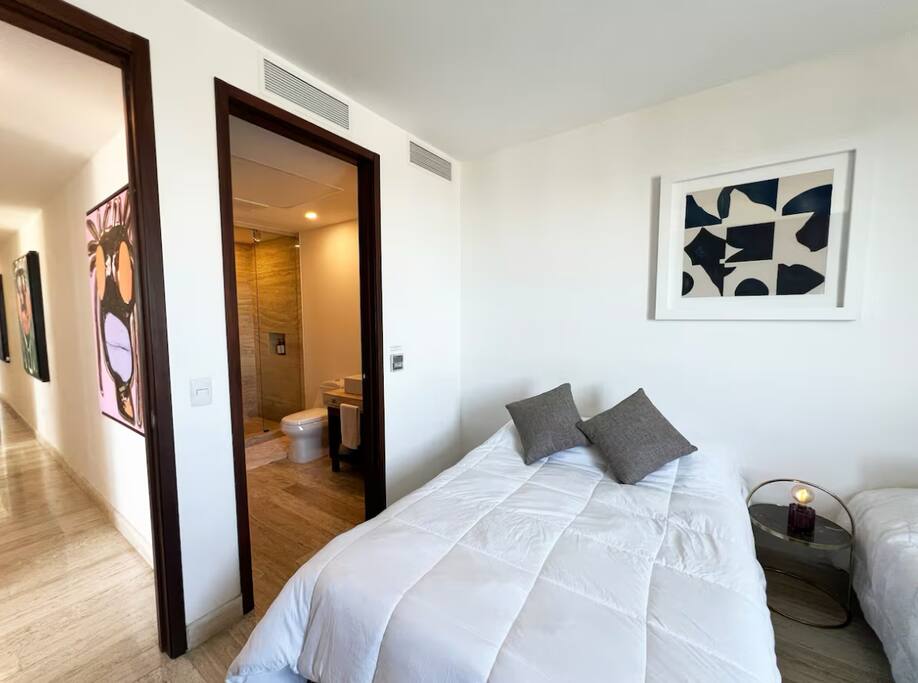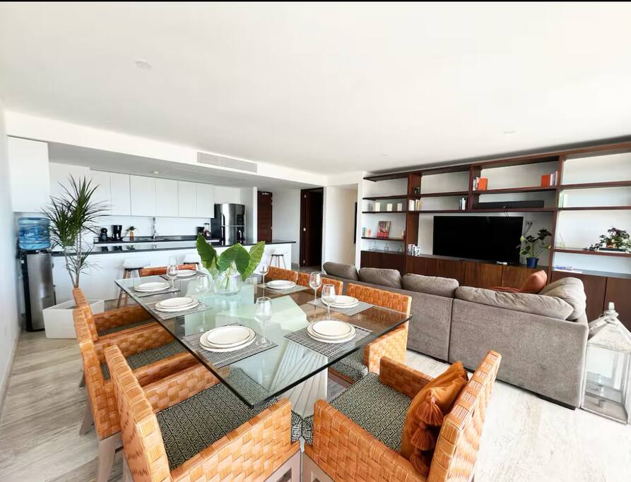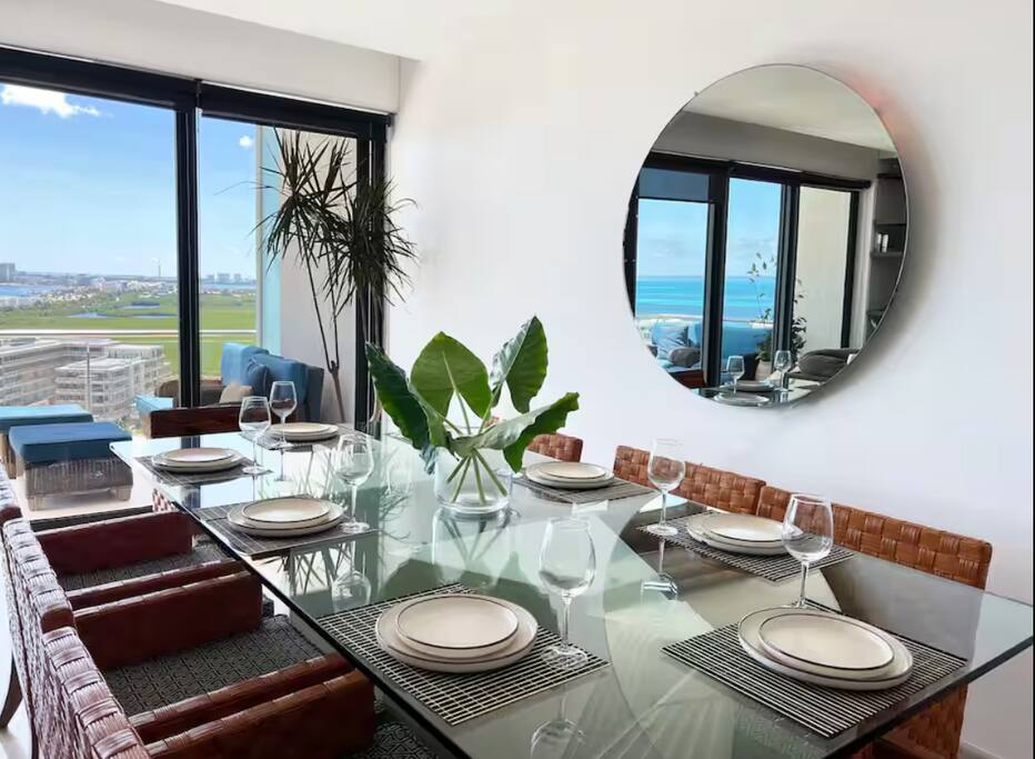 La zona más exclusiva de la zona hotelera de Cancún, Puerto Cancún. Cuenta con 2 balcones grandes, además de todas las amenidades, cafetera, aire acondicionado, hermosas sabanas blancas, mobiliario al aire libre, internet de alta velocidad, pet friendly, accessible sin escaleras para personas con discapacidad. Condominio: Disfruta de dos albercas climatizadas, acceso directo a la plaza Marina Puerto Cancun. Departamento: El departamento cuenta con entrada independiente (self check inn). Al entrar se encuentra una amplia cocina, comedor, sala y un hermoso y enorme balcón con vistas a todo Cancún, Mar, Marina, Laguna, Zona Hotelera, podrás ver todo desde que entras a este hermoso departamento. 3 cuartos con baño completo, mas un cuarto de servicio pequeño que también cuenta con baño completo dentro del mismo. Hermosa y enorme cocina equipada con todo lo necesario para cocinar, aceite, cafe, filtros, sal, agua purificada, bolsas de basura, todo incluido con su reserva en Cancún Top Rentals. Si tienen algún requisito extra con mucho gusto los podemos ayudar. Amplia zona de sala donde el mueble de estar es ideal para descansar, el comedor para 10 personas, una terraza con vista al Mar, Marina, Laguna y Zona Hotelera, podrás ver Cancún en todo su esplendor. La recamara principal con una cómoda cama King size y baño completo independiente. 2 recamaras secundarias: la primera con dos camas matrimoniales y baño completo dentro de la misma. La segunda con cama matrimonial e individual, con baño completo justo afuera de la habitación. Cuenta con wifi de alta velocidad, 2 balcones con vista al Mar, Marina, Canal y a los yates, programación de televisión con canales nacionales, internacionales, deportes, películas y series. Se puede solicitar asador de carbon pequeño, con un costo extra de US$15/día o US$25 para todos los días de su estancia. Cuenta con 2 balcones distintos, uno en el área social, y otro en el cuarto principal. Si tienes un invitado extra en tu alojamiento o bien si quieres mayor comodidad podemos agregar las siguientes opciones: -sofá cama matrimonial -colchón Inflable Es importante que esta requerimiento lo hagas previamente para tener todo listo para cuando llegues a tu alojamiento.