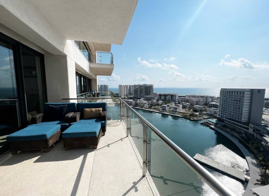 Es la zona más exclusiva de la zona hotelera de Cancún, Puerto Cancún. Disfruta de espectaculares vistas a la marina, acondicionado para 9 personas, acceso a las amenidades del edificio, como son, 2 piscinas climatizadas en los meses de invierno en Cancun, cancha de pádel, gimnasio y acceso al muelle , club de playa a 5 min, único condominio con acceso directo a la plaza comercial, cuenta con restaurantes, tiendas, cine y se aceptan mascotas.